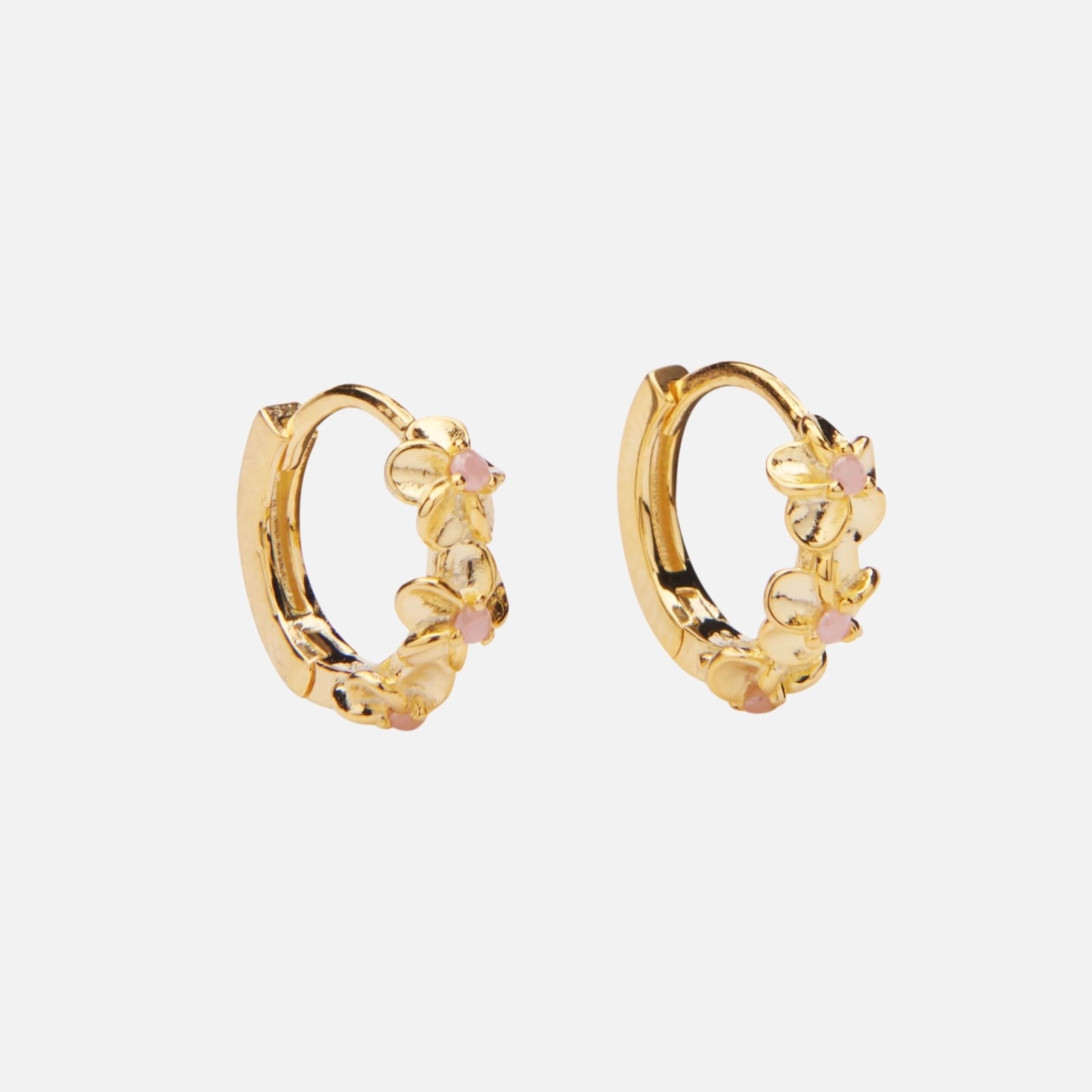 Små Aster hoop øreringe fra Pico med blomster og enten lyseblå, klare eller lilla krystaller. Øreringene er lavet a 24 karat forgyldt sterling sølv og måler 1,3 cm i diameter.